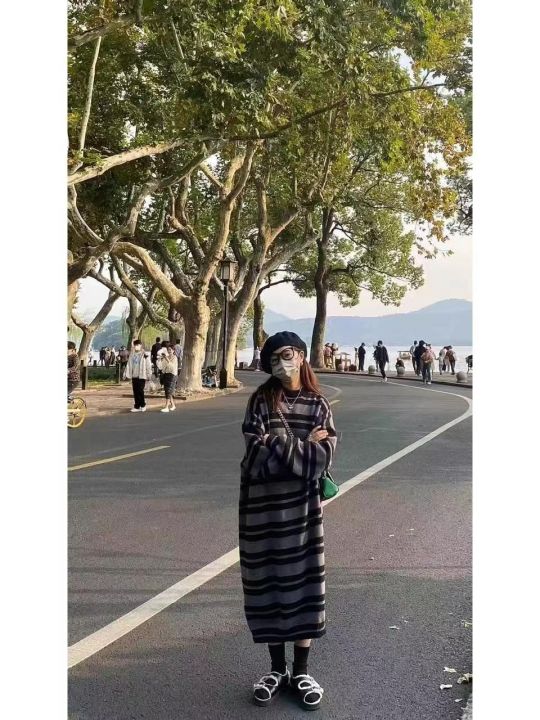 电商在售春季新款学院风条纹针织连衣裙小个子慵懒风打...
