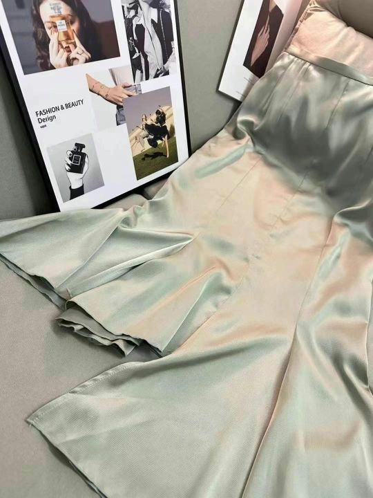 日本品牌代购法式缎面高腰不规则半身长裙气质优雅珍...