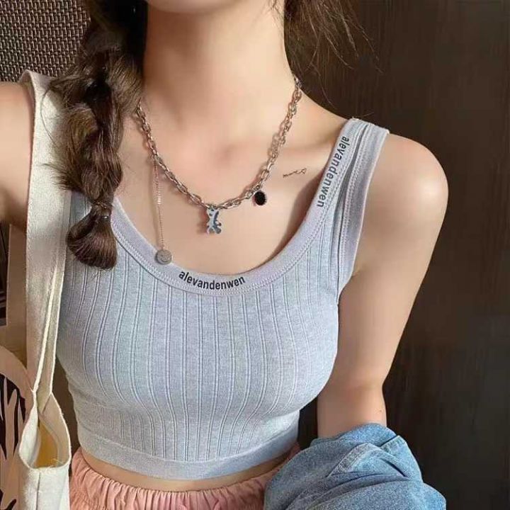 带胸垫字母设计感美背无钢圈外穿宽肩背心女上衣内搭打底抹胸(灰色830个 黑...