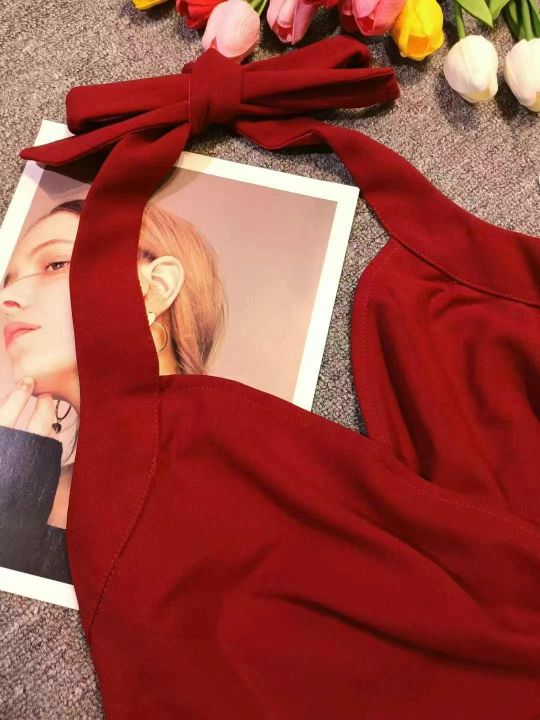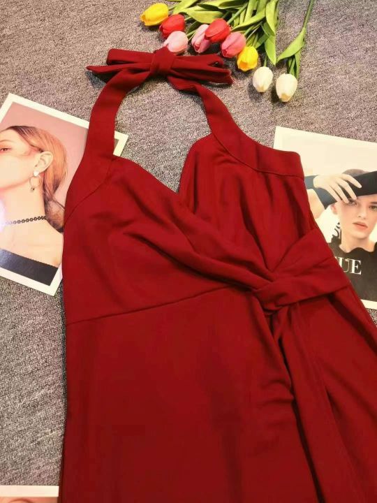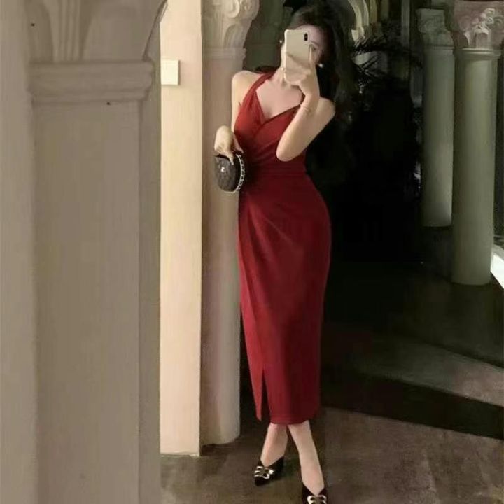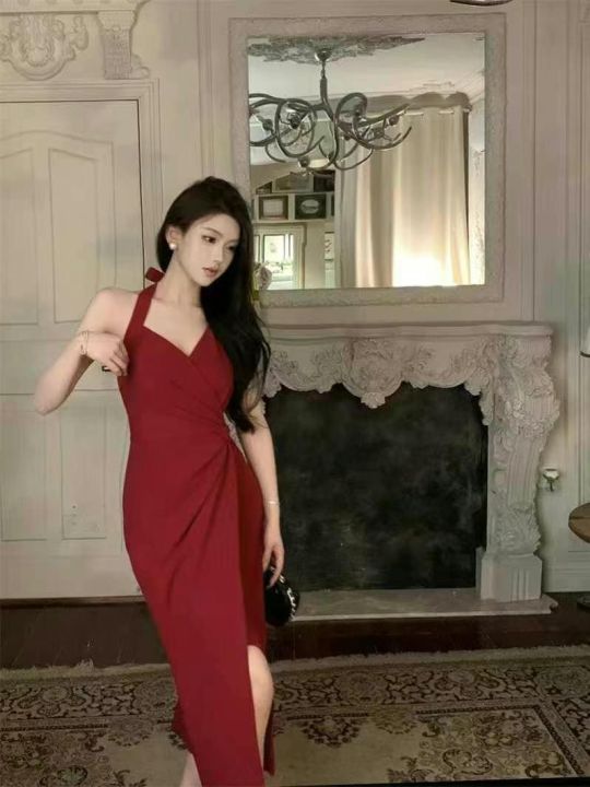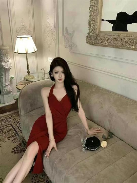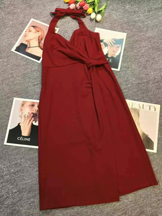品牌大码胖mm辣妹纯欲风挂脖V领开叉长款连衣裙,[爱心]65件左右,L-3XL,穿100-150斤,万佳新货,原包装️无瑕疵