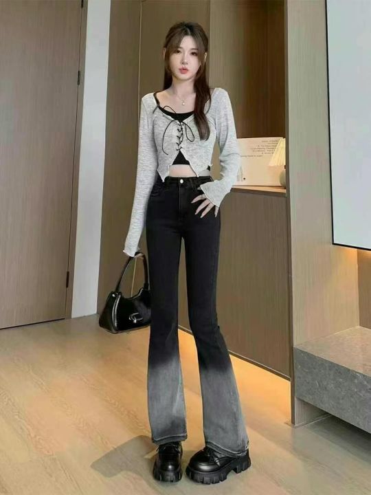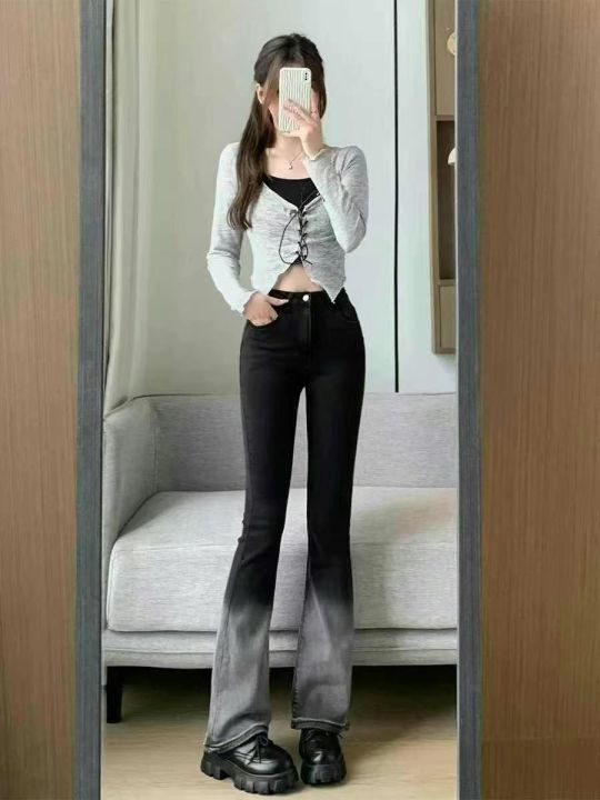 春夏新款洗水棉渐变色高弹力洗水棉牛仔微喇叭裤,独立...