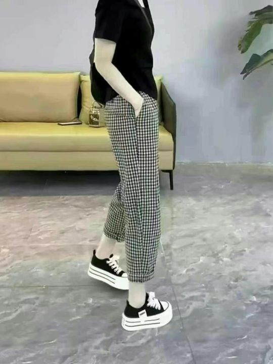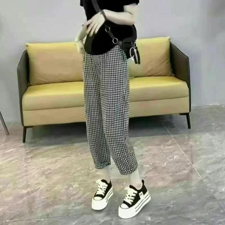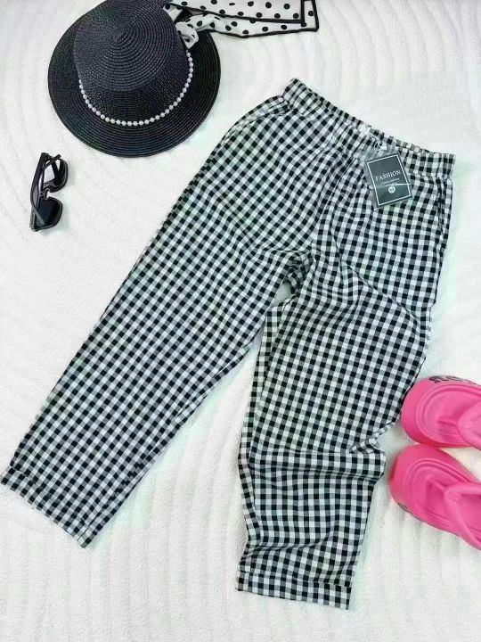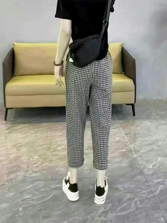 棉麻休闲妈妈裤,黑白格子九分哈伦裤