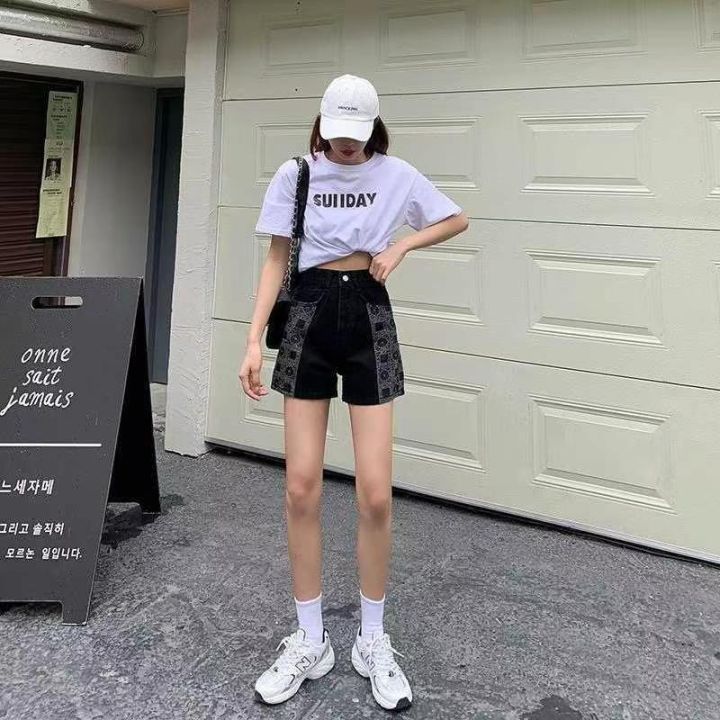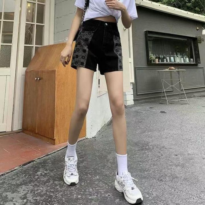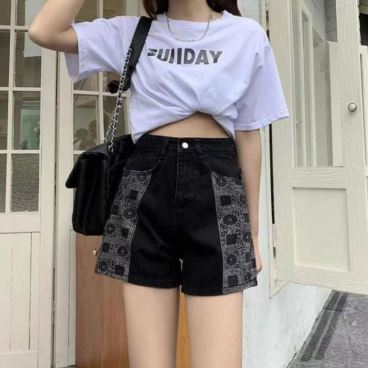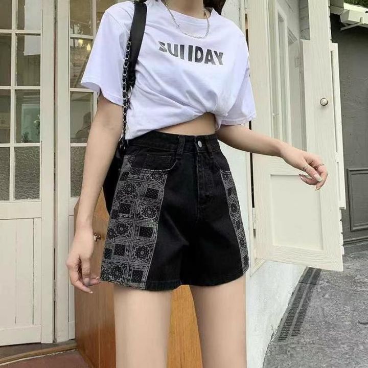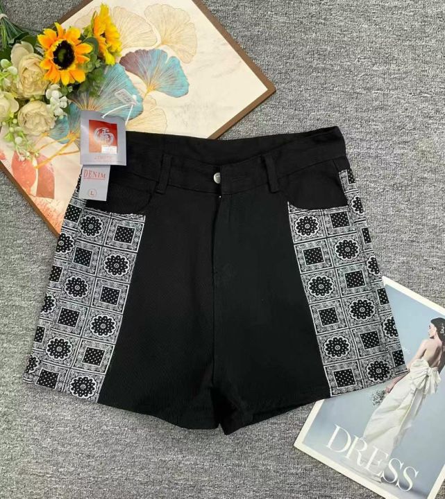 夏季新款洗水棉高腰宽松显瘦腰果花洗水棉牛仔短裤,独...
