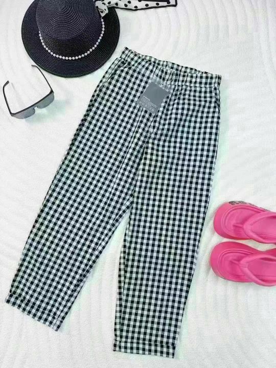 棉麻休闲妈妈裤,黑白格子九分哈伦裤