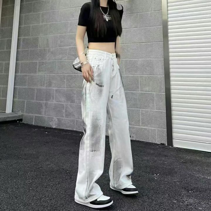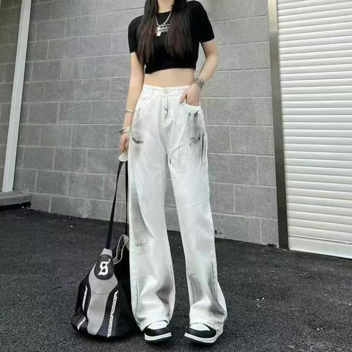春夏新款复古泼墨设计感高腰水洗扎染阔腿牛仔裤,独立...