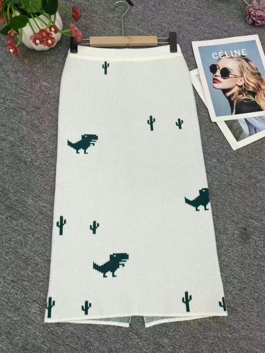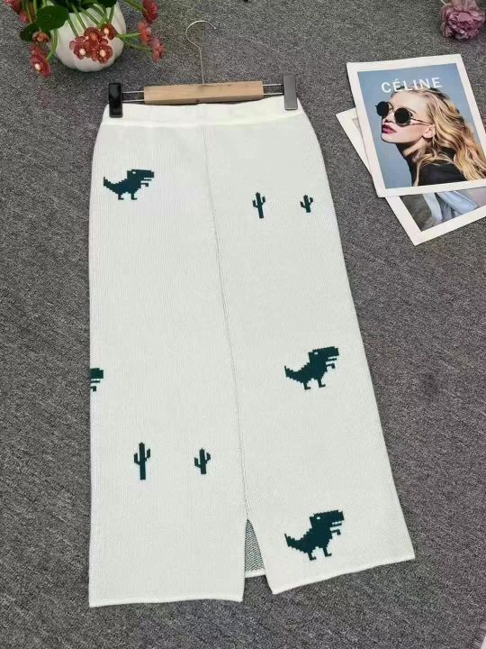 118条高品质电脑绣花小恐龙印花针织高腰半身裙,独立包装,码数S-L。