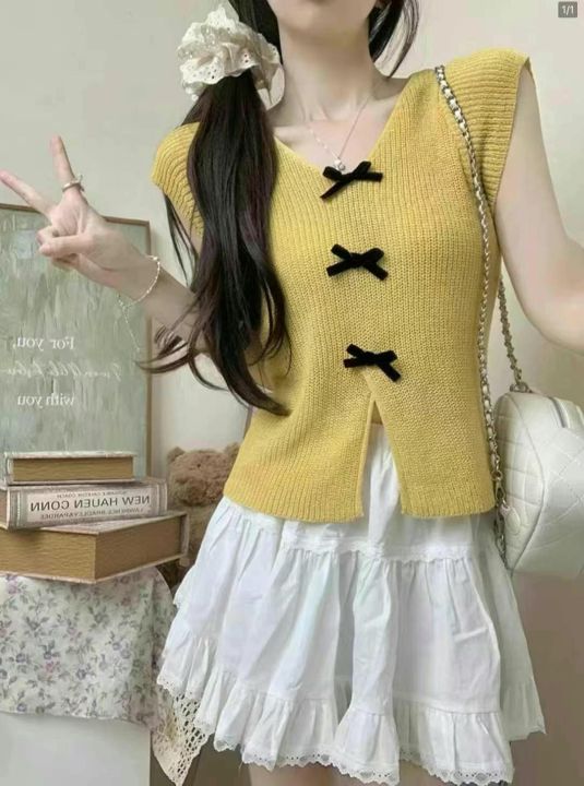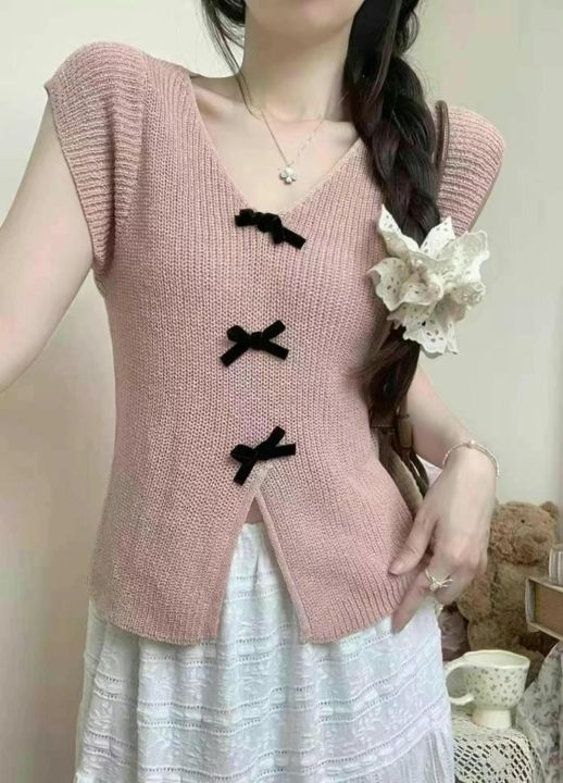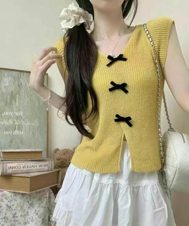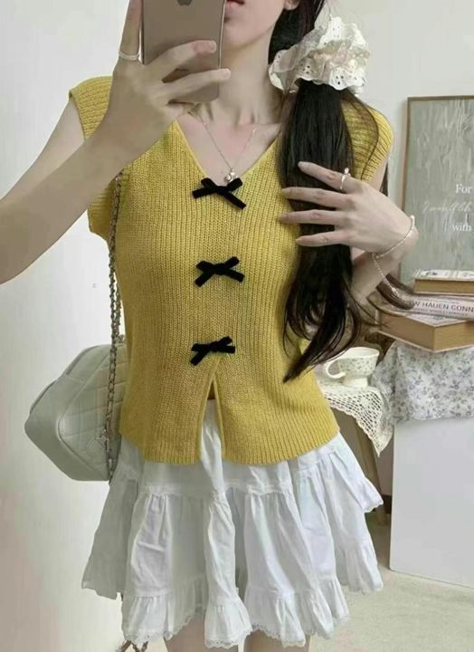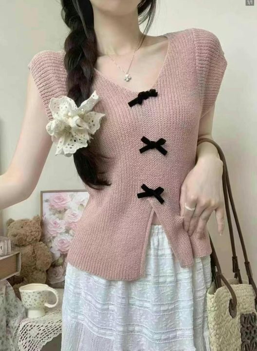 夏季新款小众飞机袖设计开立体别致蝴蝶结针织小衫,独...