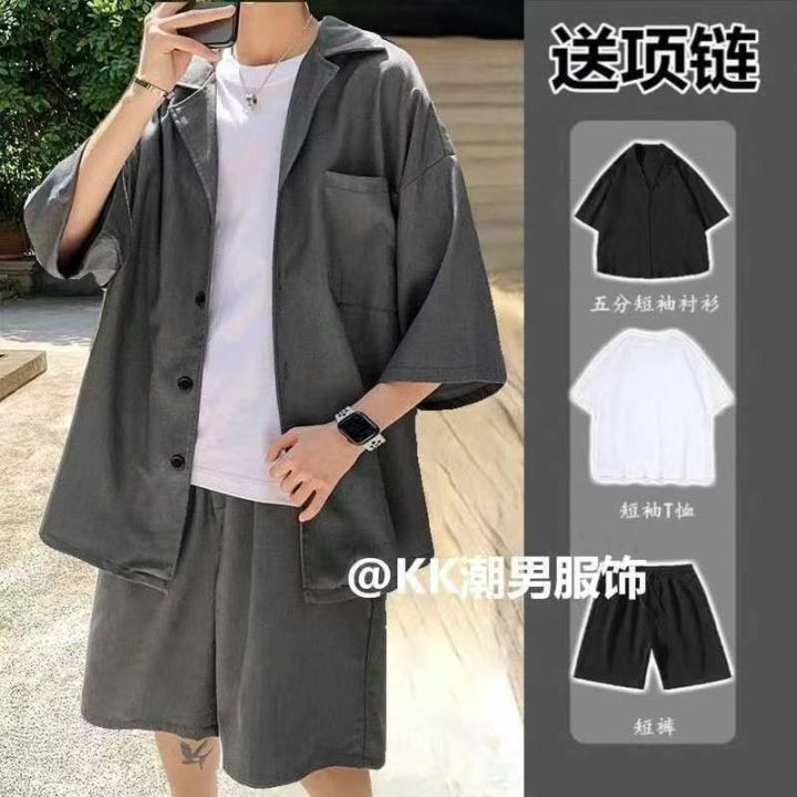 男装宽松新款休闲中裤港味ins潮运动套装,M-L码,黑色...