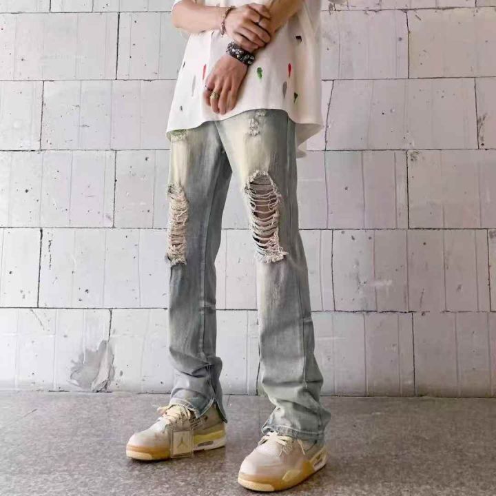 秋季新品复古做旧男女同款美式高街设计感直筒破洞窄版阔腿牛仔裤,独立包装...