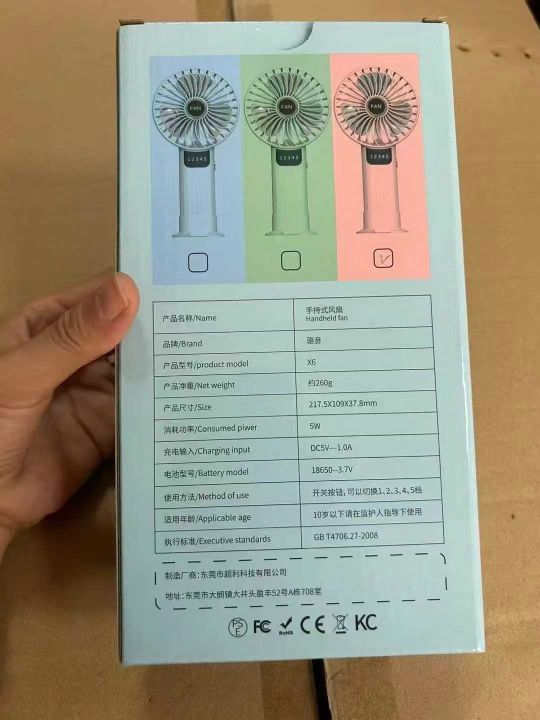 到货 3500 pcs 高端手持小风扇,一箱100个,内置 5000 毫安 18650 电池,全新未拆封。USB充电,超静音设计,5 档风力调节。带LED显示屏,带香薰