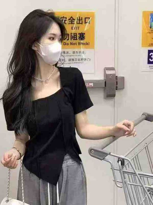 设计感靓妹冰丝方领短款显瘦正肩短袖t恤200件,码数1-6,独立包装全清5...