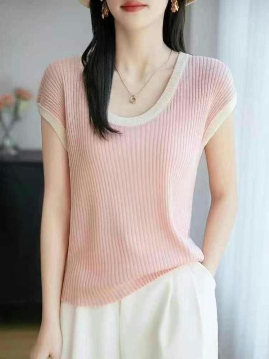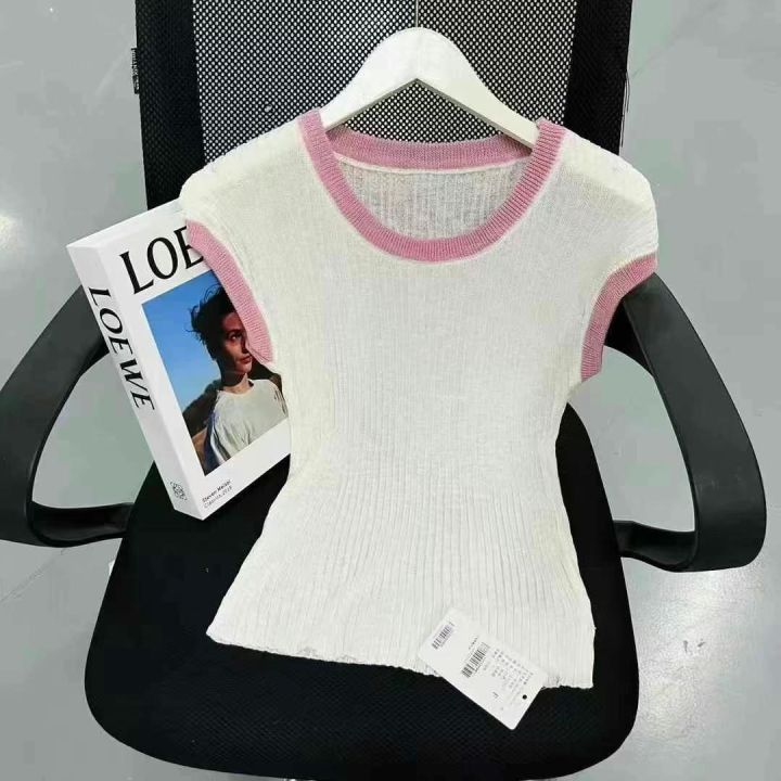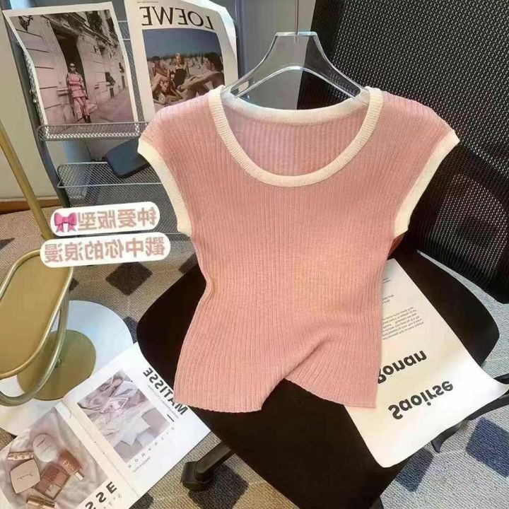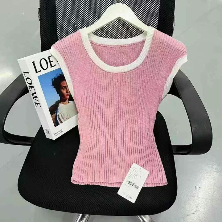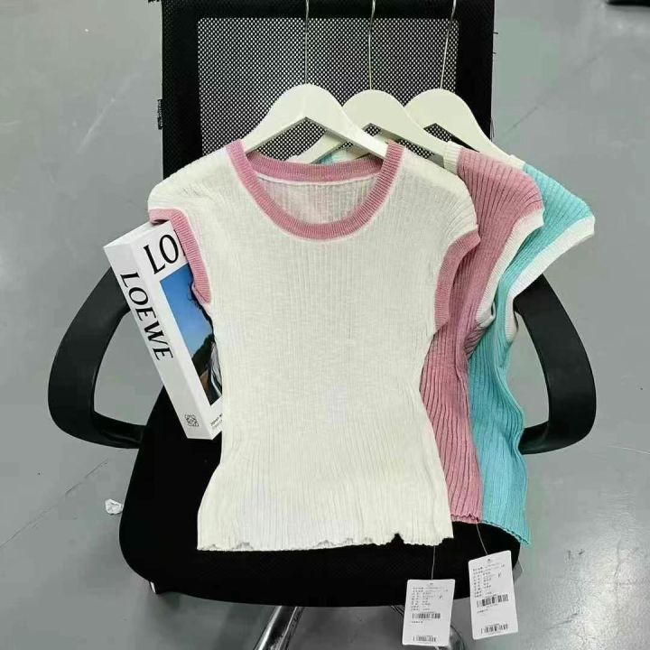 2025年十三行春季新款多巴胺U领拼色冰丝辣妹小衫,数量700件左右,单款3色,粉色,白色,蓝色,均码弹力大,面料冰爽舒适,独立包装吊牌,分货➕1随机配