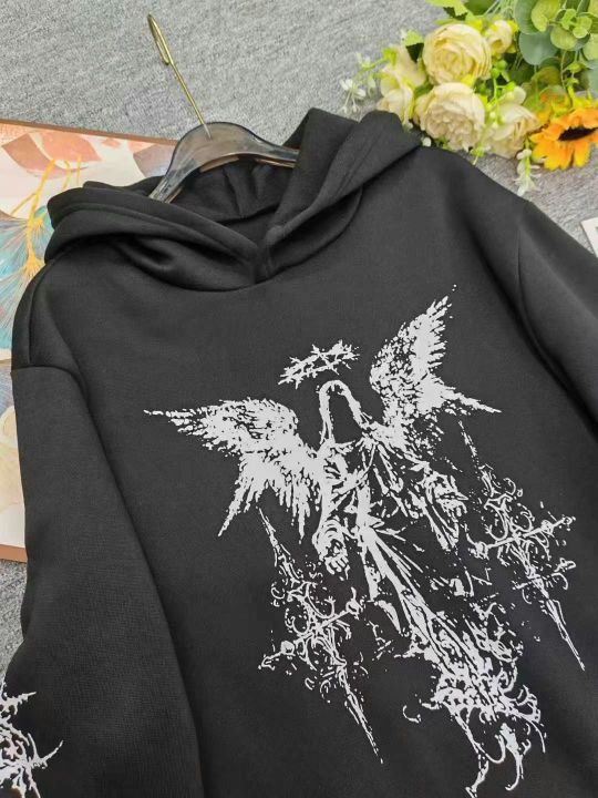 秋冬加绒男女同款宽松落肩连帽印花卫衣,独立包装,码...