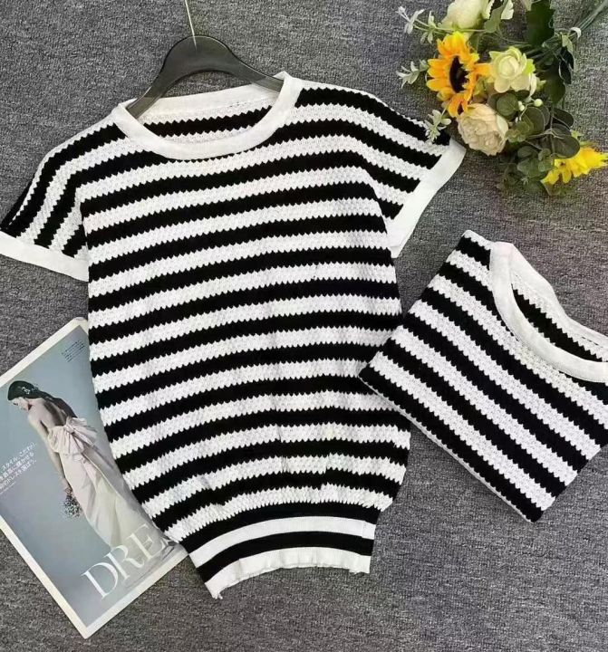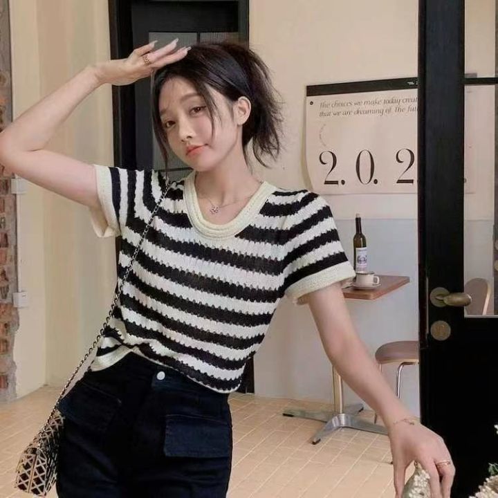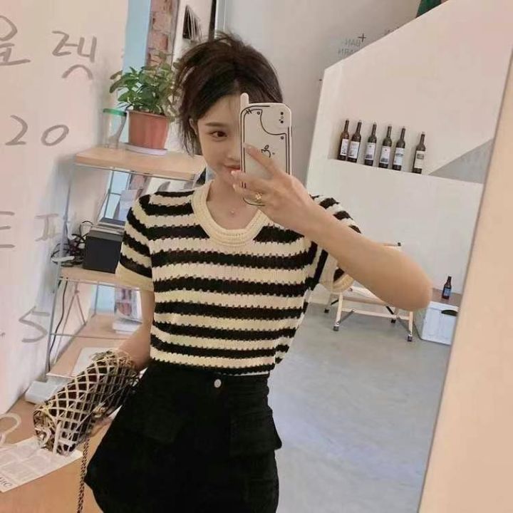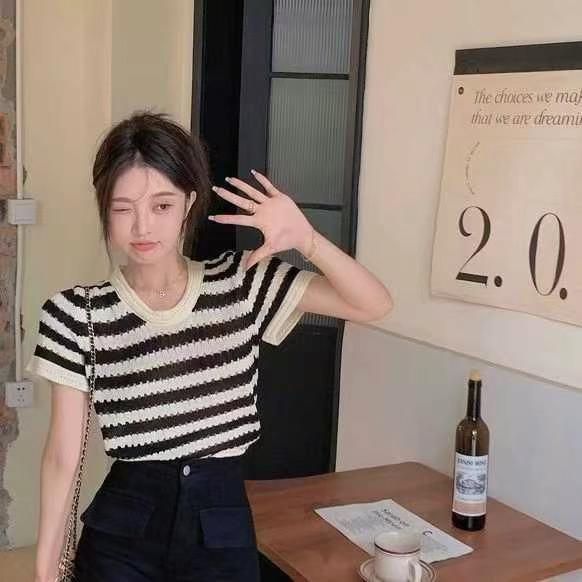 夏季新款撞色镂空条纹针织小衫,独立包装,均码面料柔...
