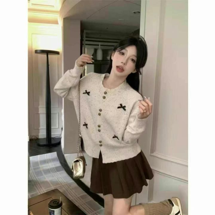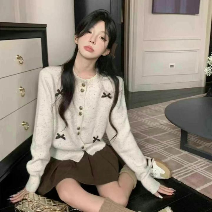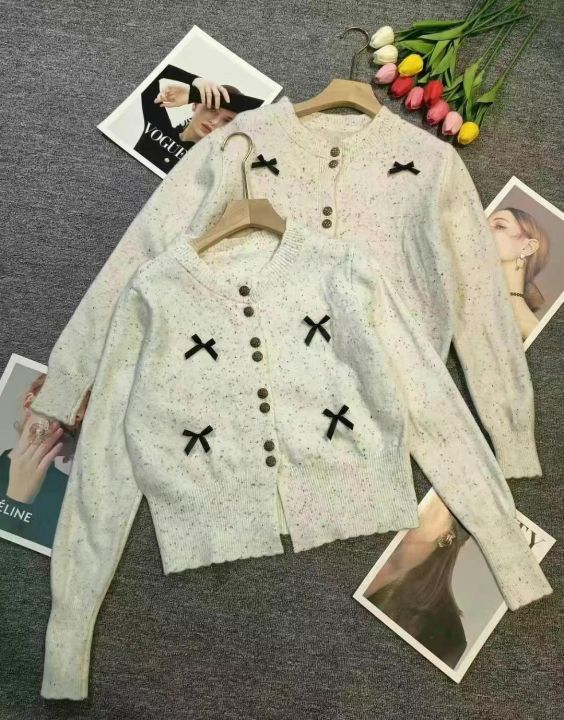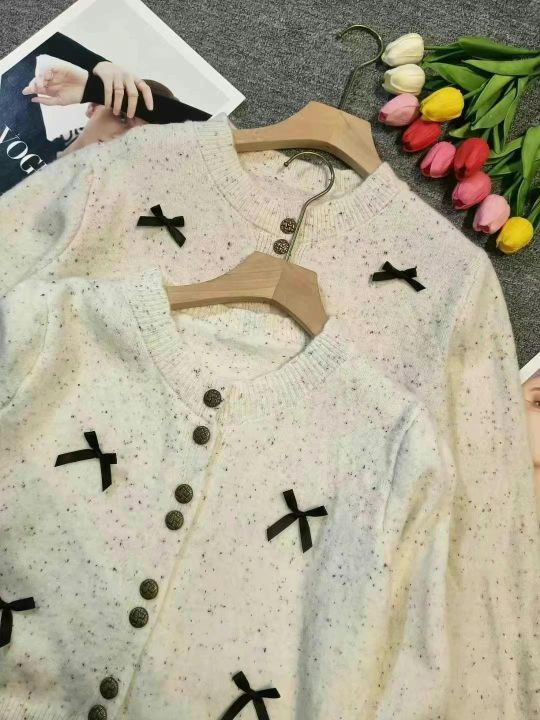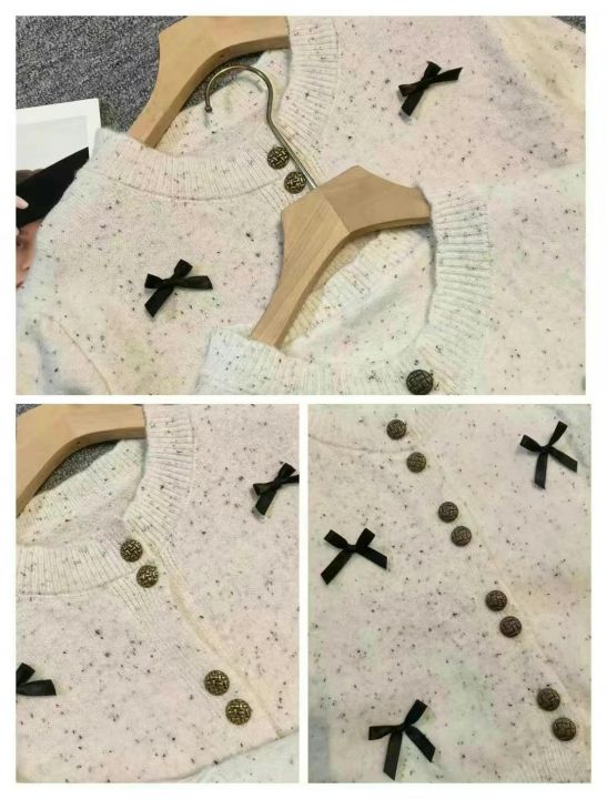 韩系小香风重工蝴蝶结铜扣设计感包芯纱针织毛衣开衫外套,[爱心]515件左右,单款两个色,白色为主,均码穿70-130斤,万佳档口新货,工厂原包装0️⃣瑕疵,[庆祝]品质杠杠的,实体店闭眼入,分货加一