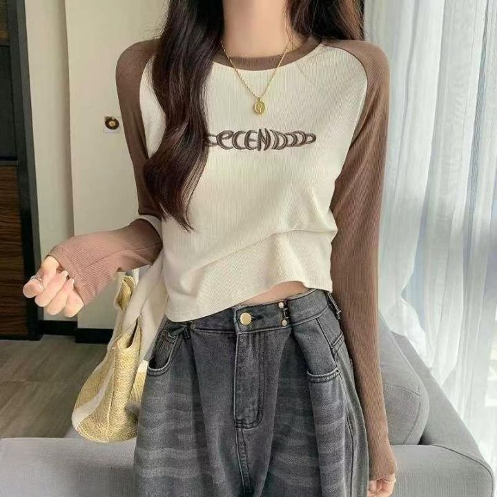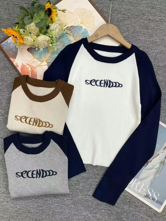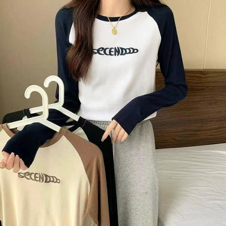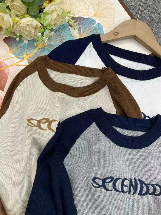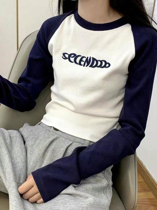 早秋新款美式复古字母刺绣插肩袖弹力修身显瘦套头毛衣...