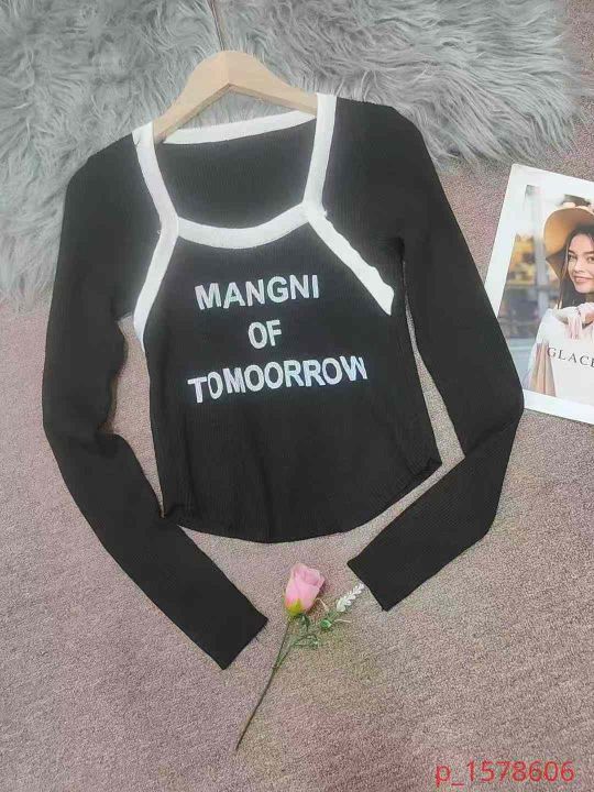 美式时髦拼色假两件方领长袖早秋新款字母修身显瘦针织上衣,品质很好,独立...
