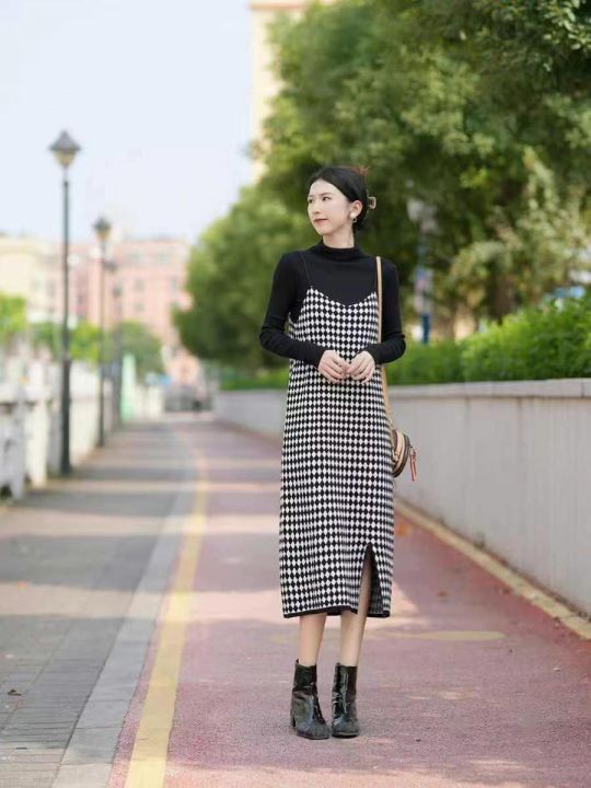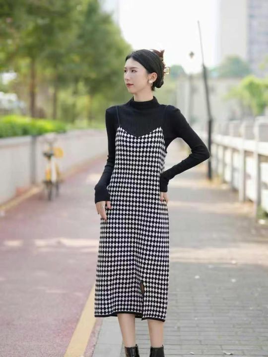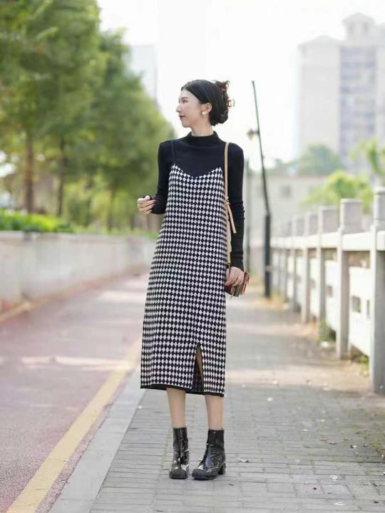 春秋新款高级感菱格纹开叉吊带针织包芯纱连衣裙,独立...