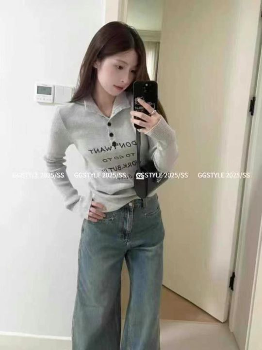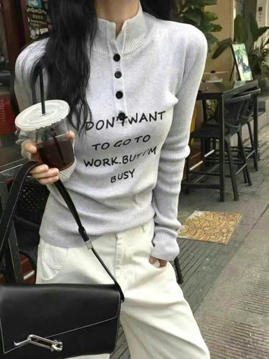 春秋新款韩系复古翻领弹力修身显瘦字母设计感气质针织...