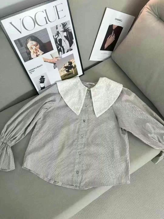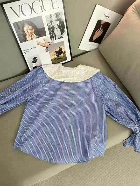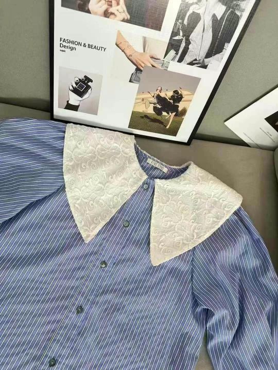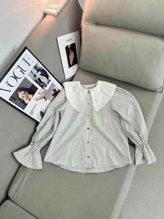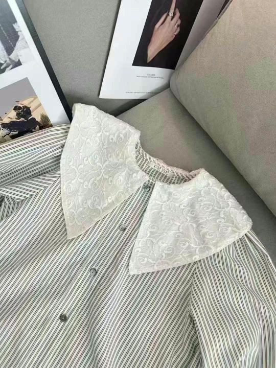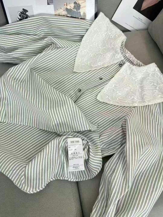 高品质设计秋季新款港风复古法式气质泡泡袖蕾丝娃娃领条纹长袖衬衫女,均码,138件,品牌原单无包装无瑕疵,超值11.8清