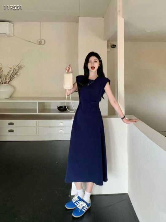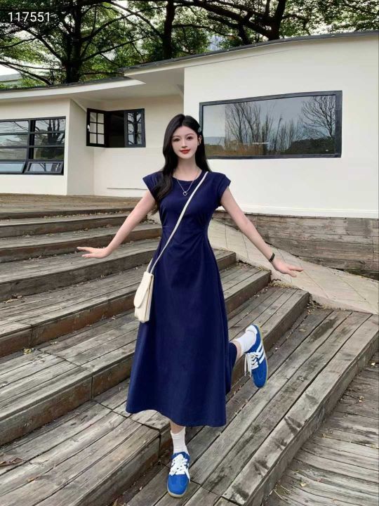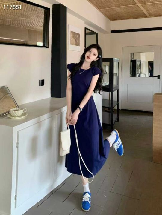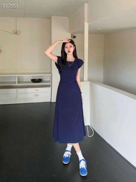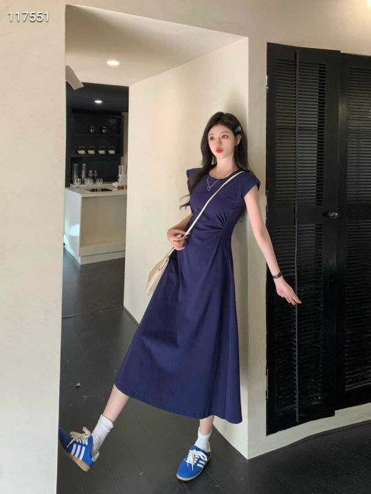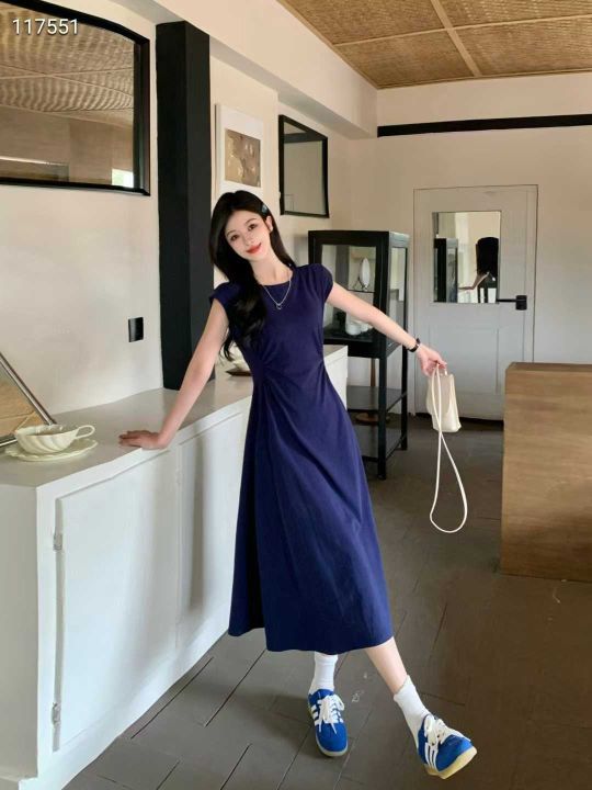 200件,法式蓝色显白圆领连衣裙女夏季新款大码胖MM修身掐腰长款连衣裙,M到4XL