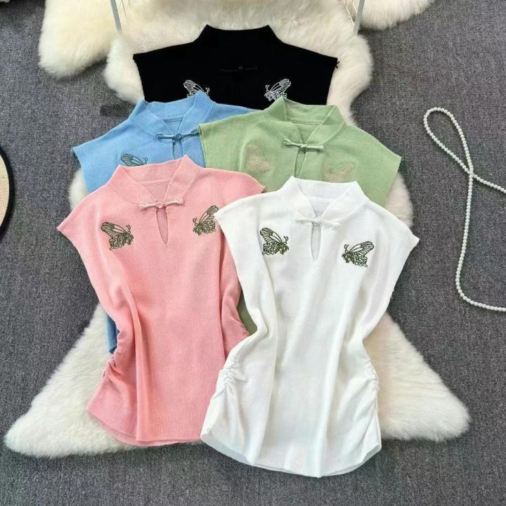 夏季新款新中式国风立领盘扣褶皱收腰显瘦针织小衫,独立包装,均码面料柔软舒适弹力大,365件,全清6.9元超低价秒杀!分货加一!(图一图二图三色为主)