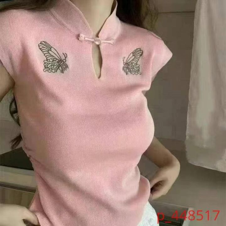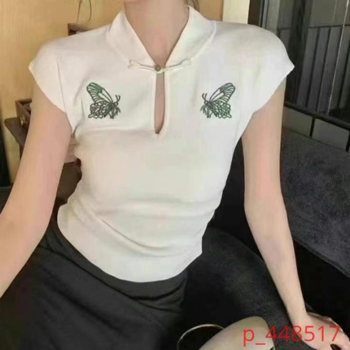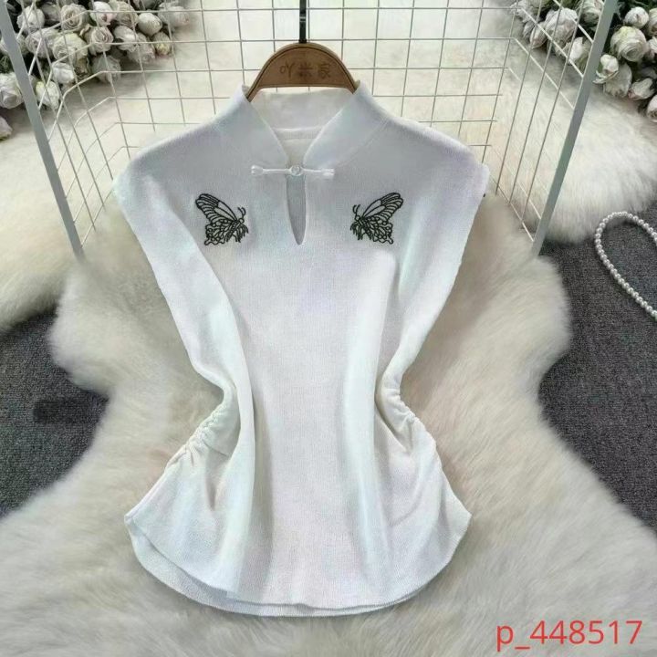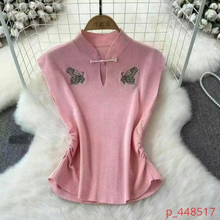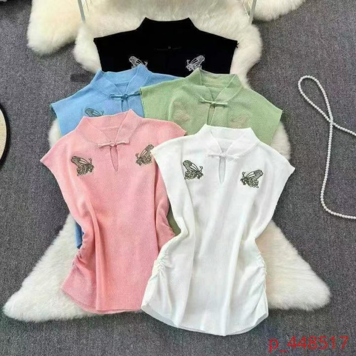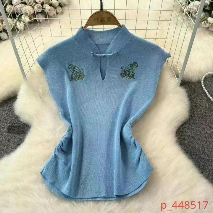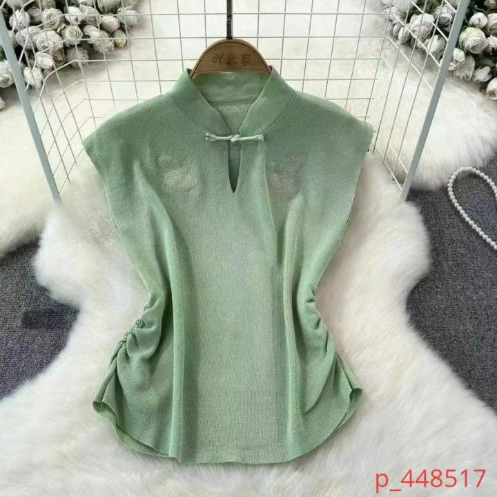 夏季新款新中式国风立领盘扣褶皱收腰显瘦针织小衫,独立包装,均码面料柔软舒适弹力大,365件,全清6.9元超低价秒杀!分货加一!(图一图二图三色为主) New Chinese Style Blouse with Stand Collar بلوزة على الطريقة الصينية جديدة_@_@