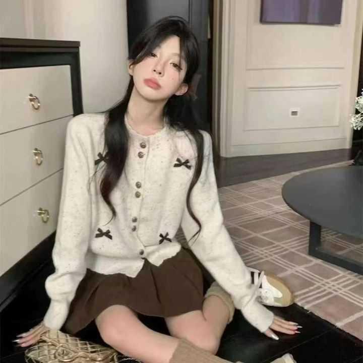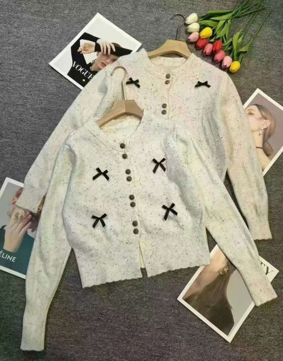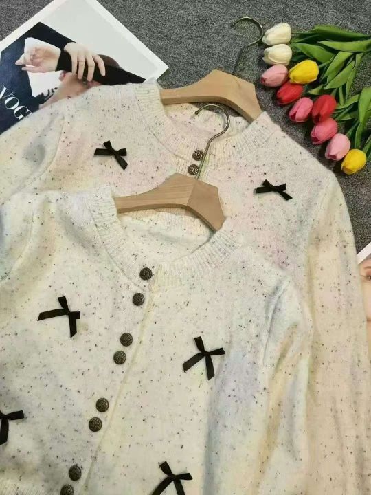 韩系小香风重工蝴蝶结铜扣设计感包芯纱针织毛衣开衫外套,[爱心]300件左右,单款两个色,白色为主,均码穿70-130斤,万佳档口新货,工厂原包装0️⃣瑕疵,[庆祝]品质杠杠的,实体店闭眼入,分货加一