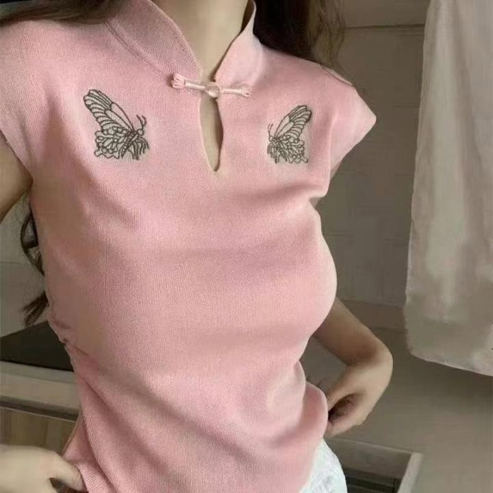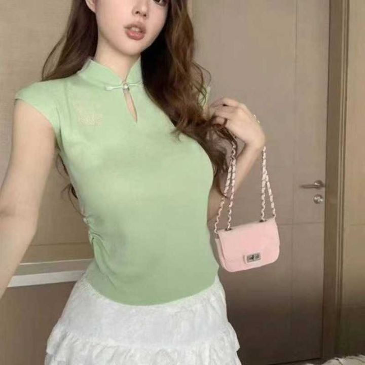 夏季新款新中式国风立领盘扣褶皱收腰显瘦针织小衫,独...