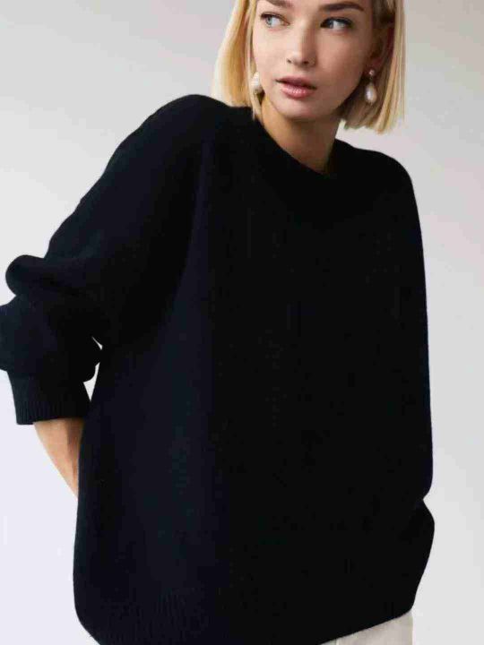 圆领黑色针织衫宽松套头毛衣 ,单款单色,下摆开衩设...