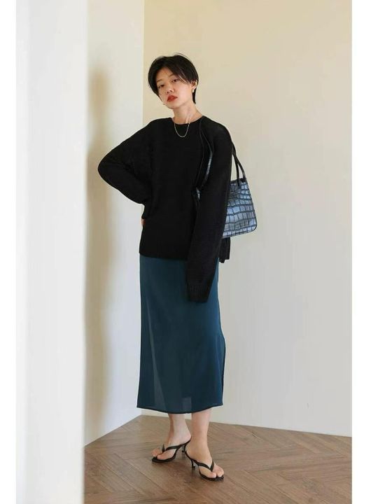 圆领黑色针织衫宽松套头毛衣 ,单款单色,下摆开衩设...