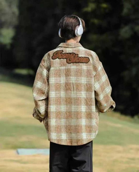 全清13.8美式vibe刺绣格子夹克男女同款春秋季宽松外套...