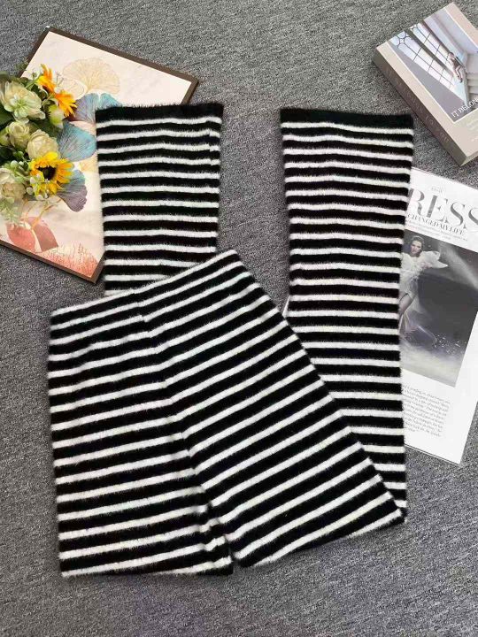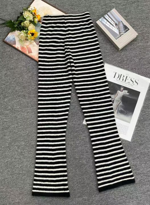 秋冬新款高腰高弹力黑白条纹阔腿微喇叭垂感休闲水貂毛针织拖地毛裤,独立包装,均码面料软糯厚实弹力大,70件,全清7.9元超低价秒杀!
