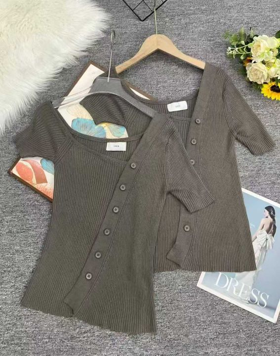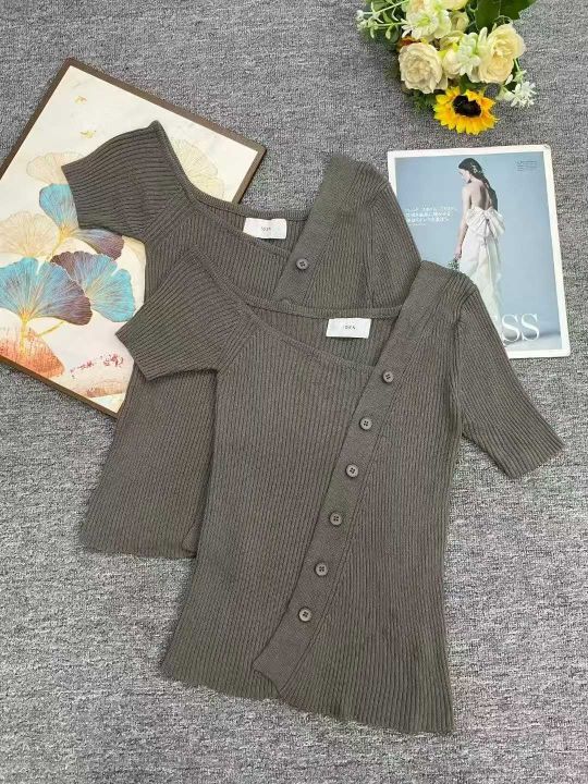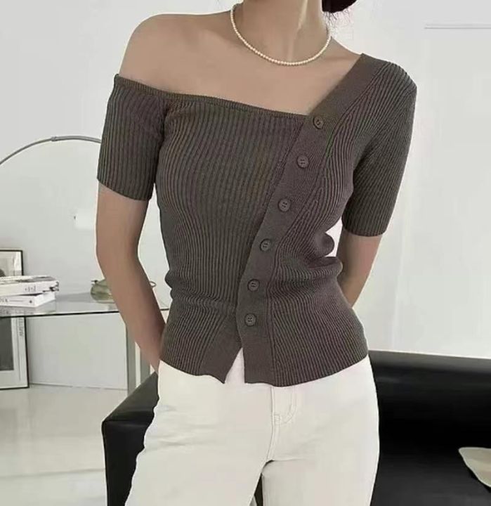 捡漏款,夏季新款法式复古设计感斜扣半露肩冰丝曲珠针织小衫,面料软糯舒适弹力大,76件,全清4.9元亏本处理