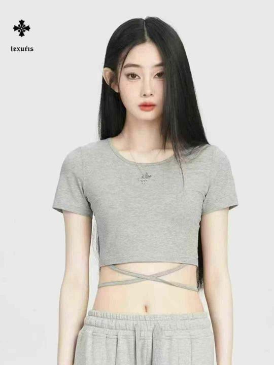 辣妹美式绑带设计感短袖t恤