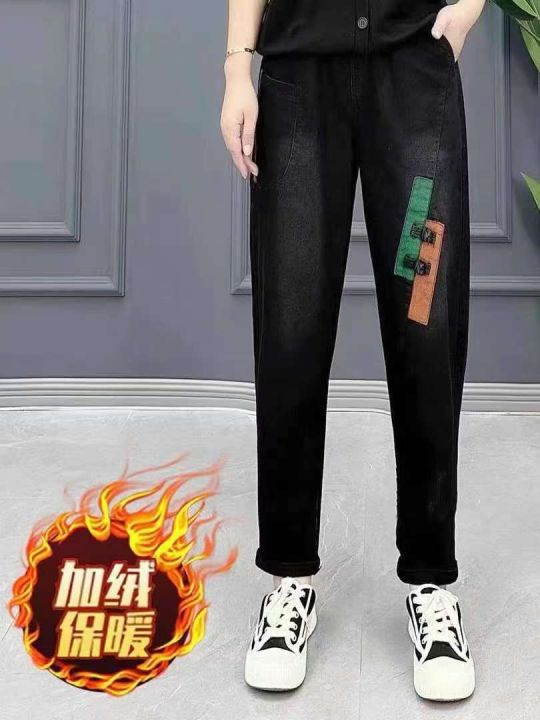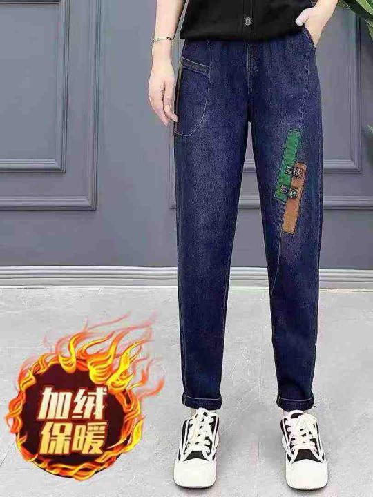 9.9清天猫仓回收96条复古盘扣秋冬加绒拼接牛仔裤女,...