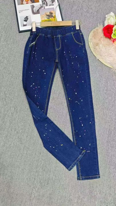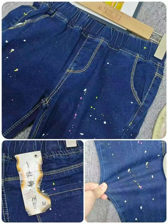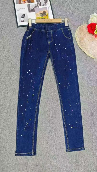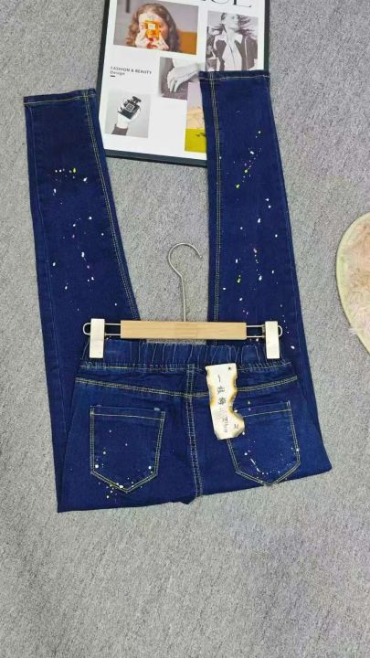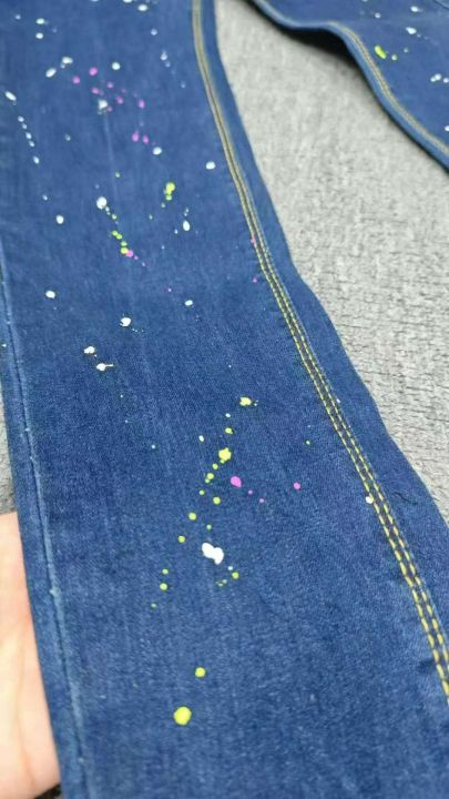 电商仓回收110件时尚彩色漆点深蓝色小脚牛仔裤,码数S-L。裤子有松紧腰,质量版型超好,微弹。全部独立包装。