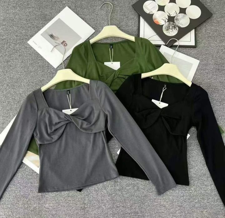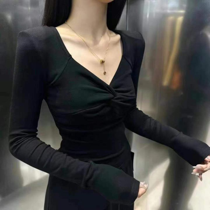 辣妹长袖☕️纯欲扭结V领交叉性感上衣女秋季修身显瘦褶皱内搭气质磨毛T恤纯棉质量57件全清7.8独立包装,均码高弹力,单款3色