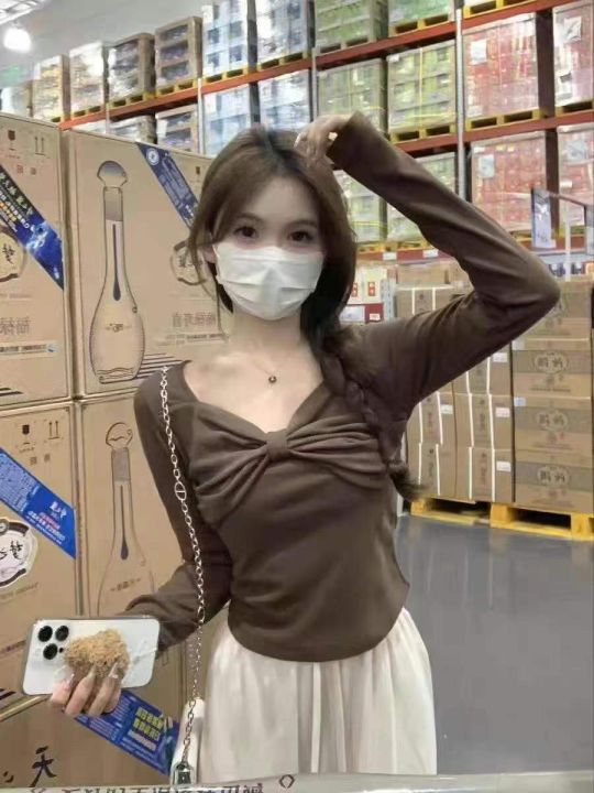 辣妹长袖☕️纯欲扭结V领交叉性感上衣女秋季修身显瘦...