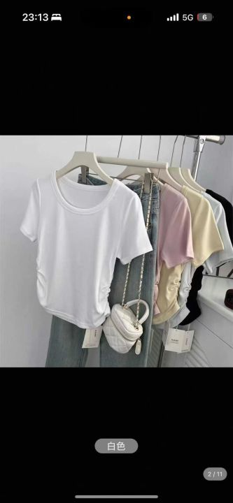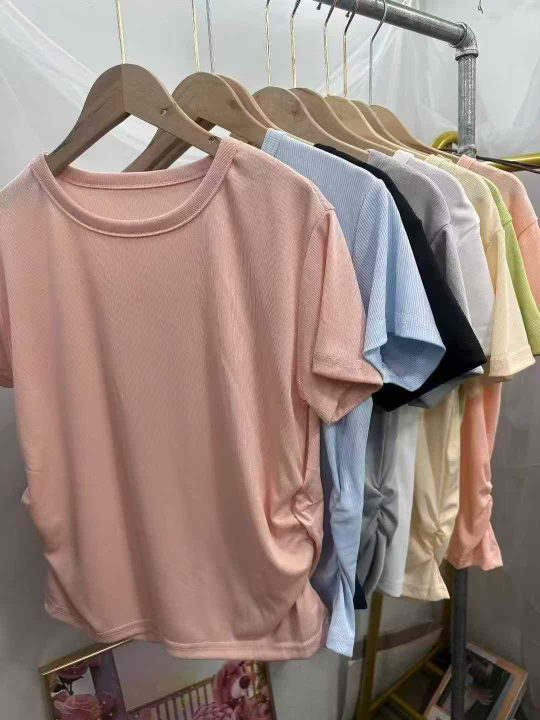 冰丝螺纹显瘦抽皱小蛮腰不规则短袖,侧边有抽皱设计,...