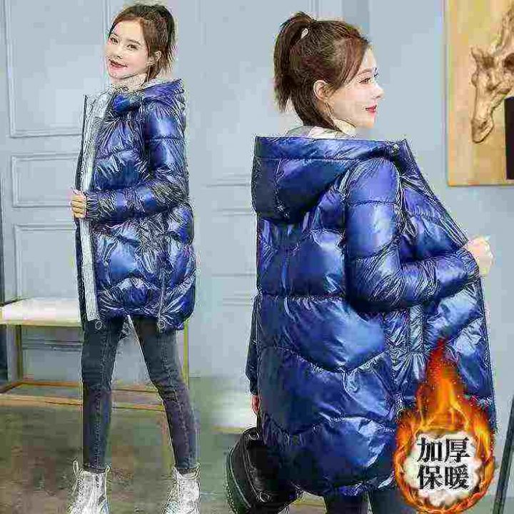 免洗棉服女亮面,韩版棉衣女中长款冬季宽松加厚连帽羽绒棉外套,独立包装,...