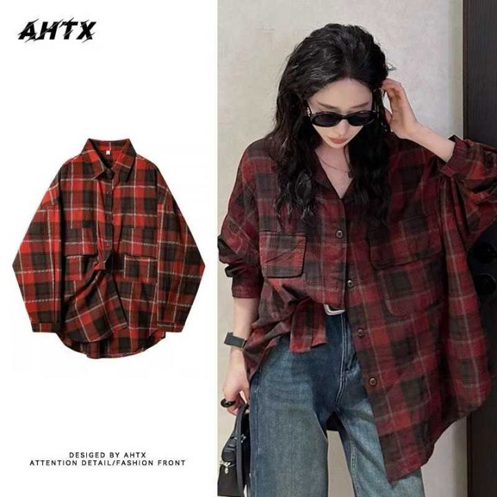 春秋美式复古新款格子慵懒衬宽松长袖休闲衬衣上衣开衫外套,独立包装,S -...