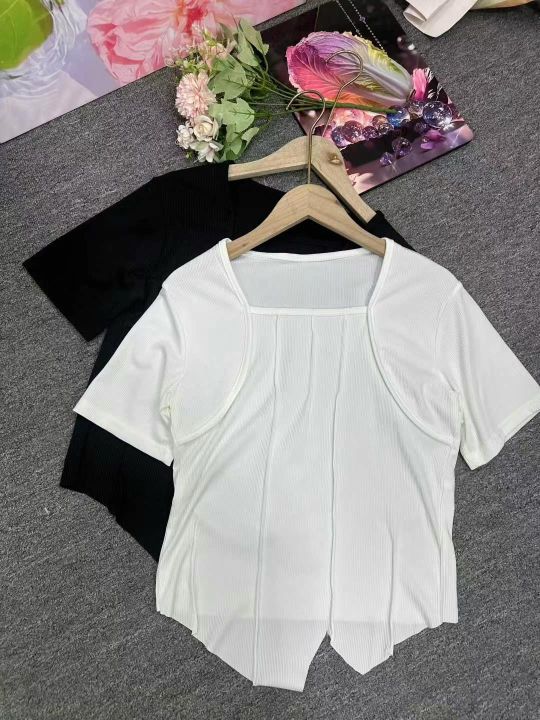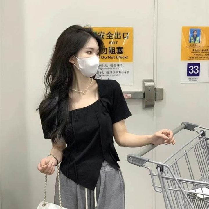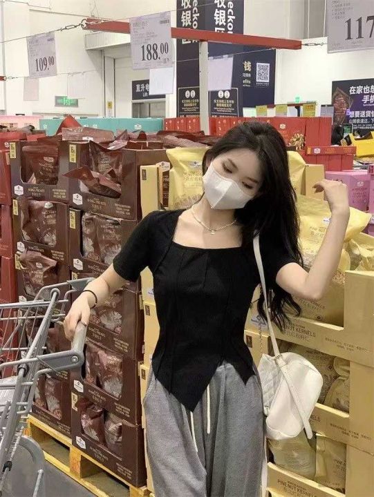冰丝螺纹纯欲方领短袖t恤女2025夏季修身chic别致独特甜辣妹正肩短款上衣,1到6码,独立包装,货品干净,1400件左右,5.8清,分货加1