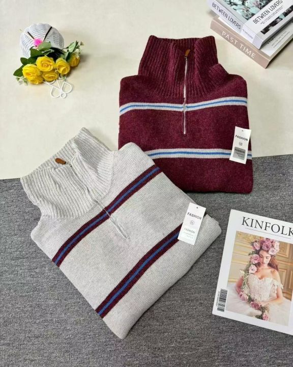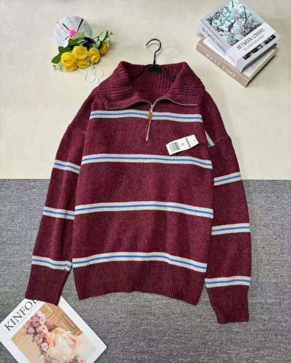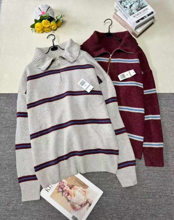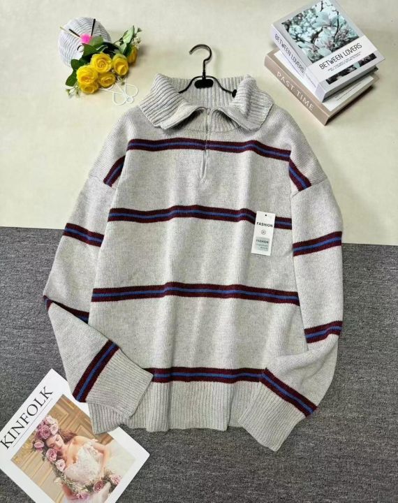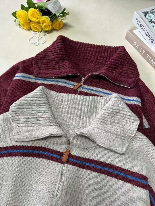男女大版型厚重美式复古条纹慵懒风宽松拉链翻领套头毛衣,整款两色,品质好,独立包装,S-4XL,700件左右,清9.9,分➕1
