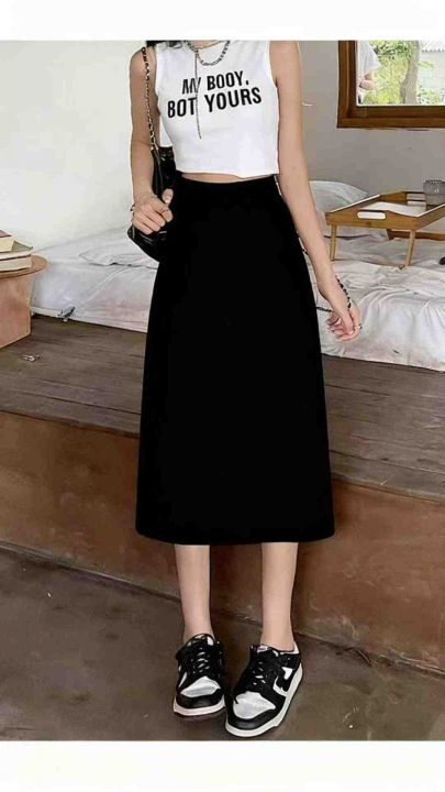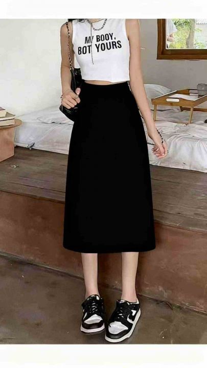 春夏新款网红a字遮胯显瘦中长款半松紧腰开叉冰丝顺滑休闲西装裙,独立包装...