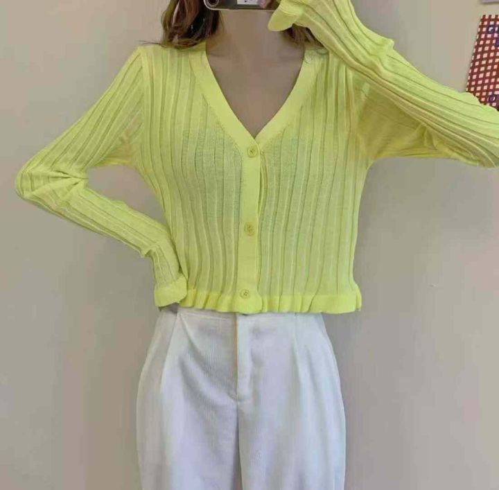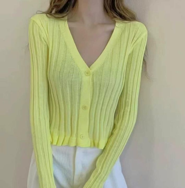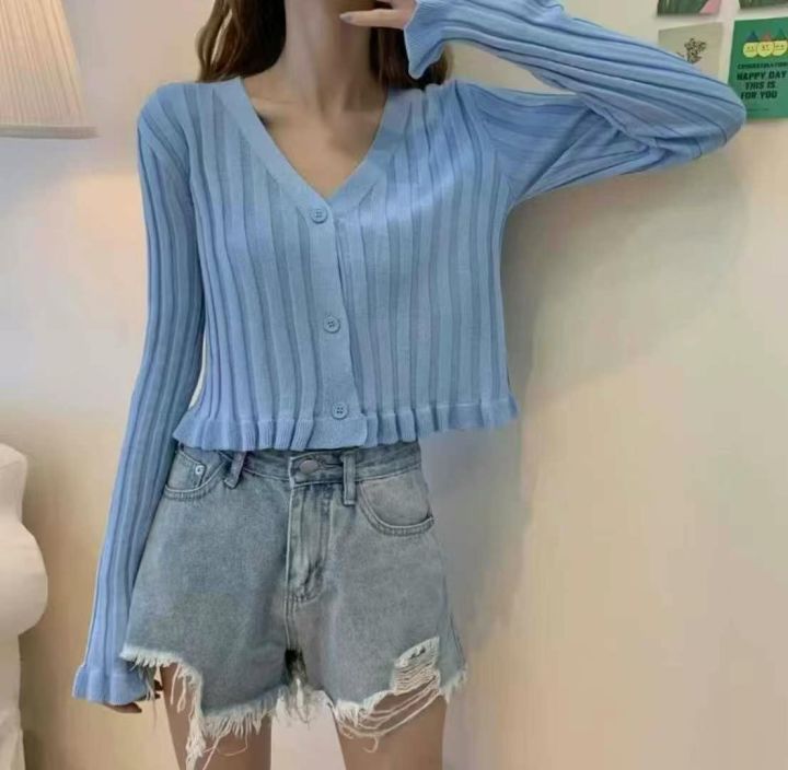 早秋新款薄款纯色洋气荷叶边v领长袖短款针织开衫,独...