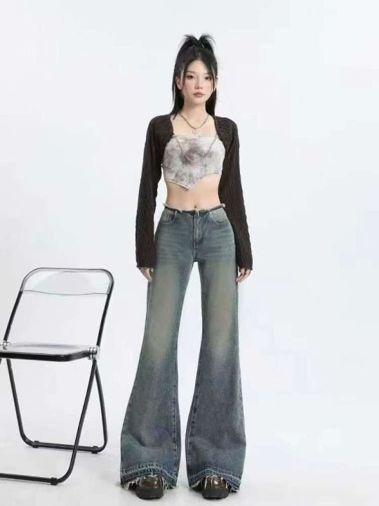 夏季新款美式辣妹复古微喇叭毛边阔腿牛仔裤,独立包装...