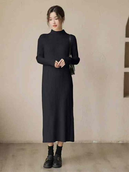 半高领内搭针织连衣裙女秋冬修身温柔气质开叉毛衣温柔...