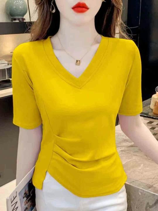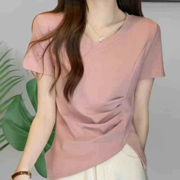 时尚洋气百搭v领褶皱纯棉大版短袖t恤,整款三色,领口...
