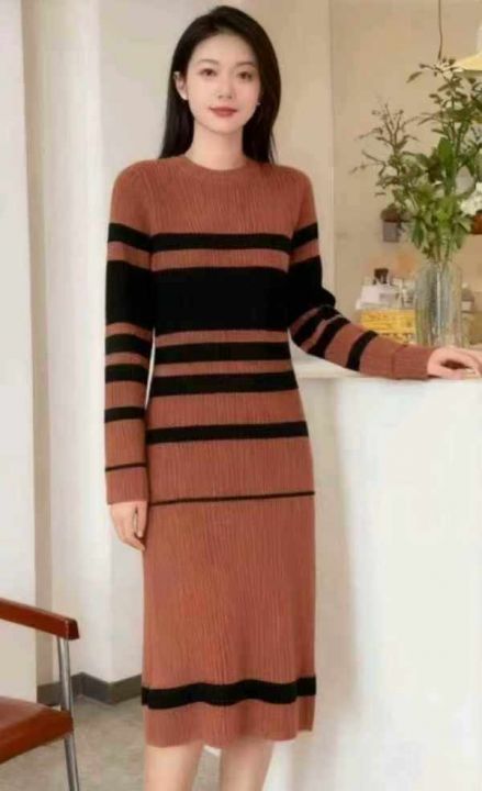 秋冬新款法式复古撞色条纹针织毛衣连衣裙,独立包装,均码面料软糯厚实,91...